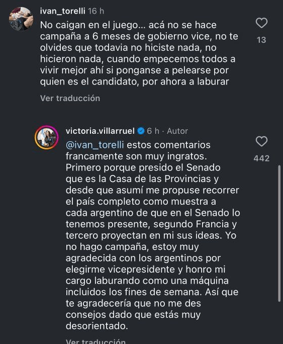 Si bien para Adorni, el cruce “hizo más ruido de lo que fue. Fue simplemente una pavada y no, el Presidente no ha hablado con la vicepresidente en estos días”, lo cierto es que Villarruel no solo no se retractó, sino que dejó el tuit fijado en su perfil y redobló la apuesta: también en la red social X, le retrucó a un usuario que la cuestionó por hacer campaña con sus viajes.