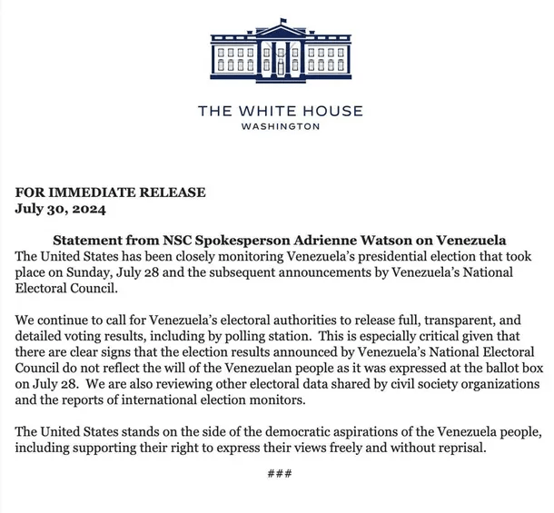 “Seguimos pidiendo a las autoridades electorales de Venezuela que publiquen los resultados electorales completos, transparentes y detallados, incluidos los desglosados por colegios electorales”, señala el comunicado emitido este martes por el Consejo de Seguridad Nacional norteamericano.
