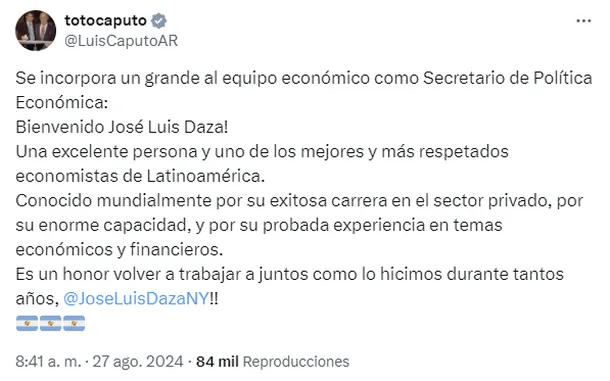 “Se incorpora un grande al equipo económico como Secretario de Política Económica: ¡Bienvenido José Luis Daza!”, anunció con entusiasmo Caputo en una publicación realizada en su cuenta personal de X (ex Twitter) hoy por la mañana.