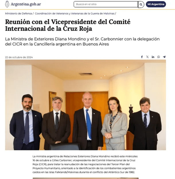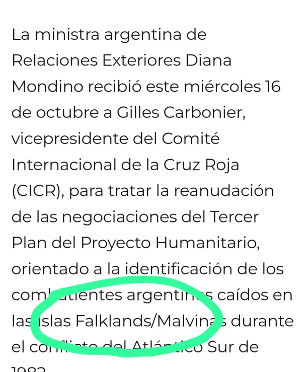 Este incidente ocurrió en la redacción del documento oficial donde el Gobierno relató un encuentro entre Mondino y el vicepresidente del Comité de la Cruz Roja, Gilles Carbonier, reunión que tenía por objeto apuntalar la reanudación de las negociaciones del Tercer Plan del Proyecto Humanitario, orientado a la identificación de los combatientes argentinos caídos en las islas Malvinas.