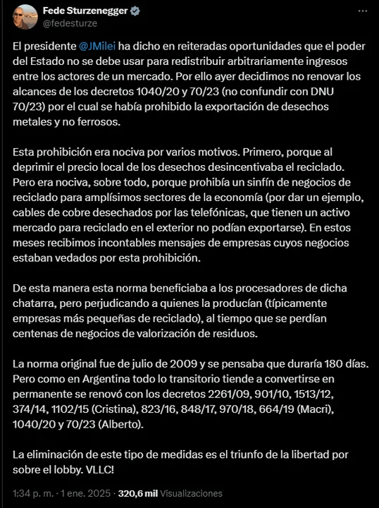 Sturzenegger añadió que esta prohibición beneficiaba a los grandes procesadores de chatarra, pero perjudicaba a los productores más pequeños y limitaba el acceso al mercado internacional.