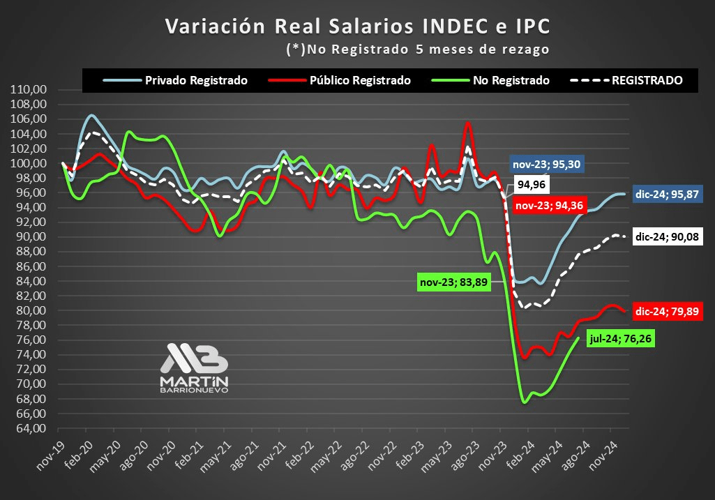 En el último mes previo a la llegada de Milei (noviembre de 2023), el salario real de los trabajadores no registrados se ubicaba en 83,9 puntos (habían perdido casi 16 puntos respecto del inicio del gobierno de Alberto Fernández). Los salarios públicos en 94,3 y los privados en 95,3, es decir también perdieron en los cuatro años de A.F. pero menos que los no registrados. Mientras tanto, el salario promedio para trabajadores registrados y no registrados se ubicaba en 95.