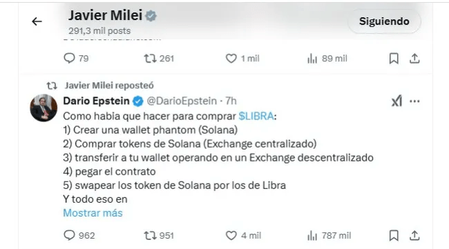 En el posteo de Epstein se asegura que, por la dificultad de la operatoria con criptomonedas, ningún “jubilado” fue afectado. Tras el reposteo, el precio de la shitcoin $LIBRA avanzó a 0,6 dólares, lejos del 1,3 dólares con que inició el derrotero viernes.