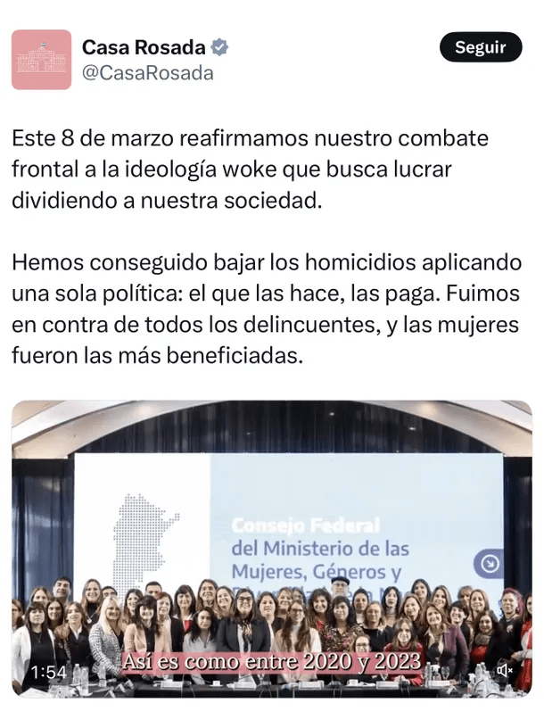 El Gobierno nacional publicó este sábado 8 de marzo un video por el Día Internacional de la Mujer con críticas a la “ideología de género”, la “cultura woke” y las decisiones políticas de la administración anterior respecto de la creación del ex Ministerio de Mujeres, Géneros y Diversidad.