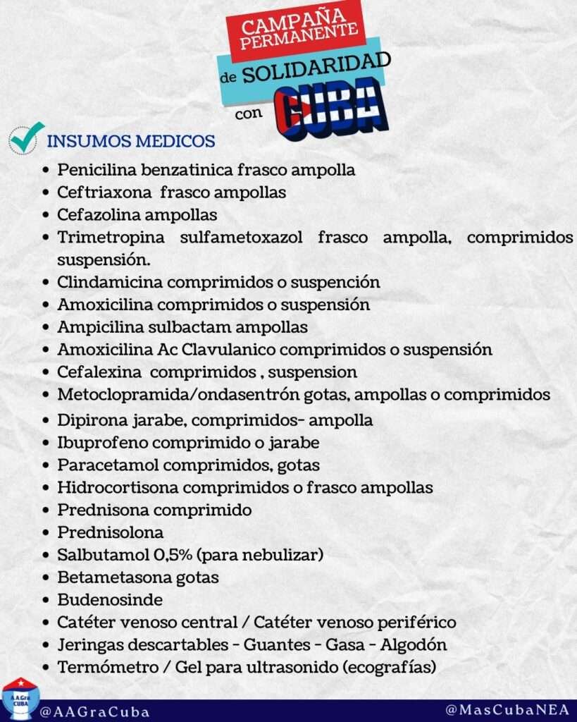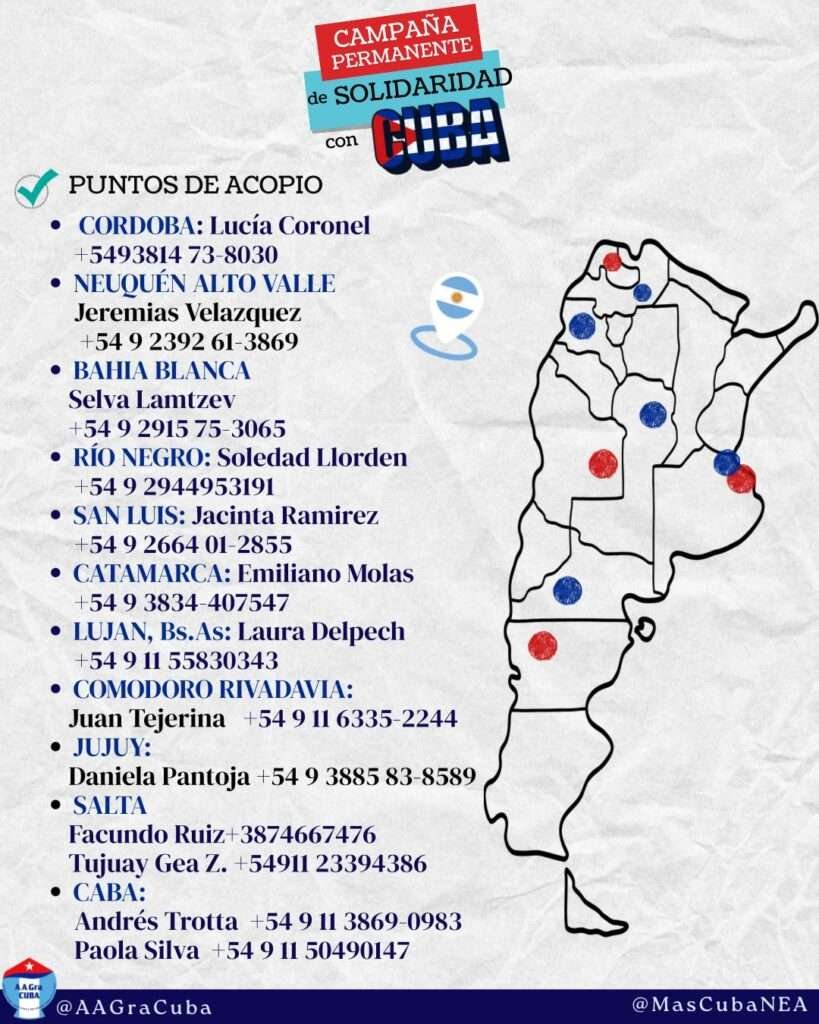 El texto se difundió junto con una campaña concreta: una colecta internacional de insumos médicos destinada a hospitales cubanos, con puntos de acopio en distintas ciudades argentinas —entre ellas Córdoba, Neuquén, Bahía Blanca, Río Negro, San Luis, Catamarca, Luján, Comodoro Rivadavia, Jujuy, Salta y CABA— coordinada por organizaciones solidarias.