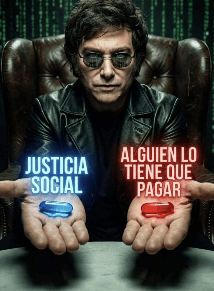 El Presidente publicó una imagen caracterizado como el personaje de Matrix, con dos pastillas en la mano: una azul bajo el rótulo “Justicia Social” y otra roja con la frase “Alguien lo tiene que pagar”. La puesta en escena, pensada para reforzar su cruzada ideológica, generó una ola de críticas incluso entre votantes que expresaron