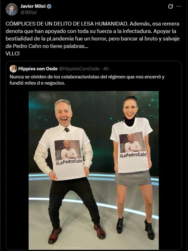 A través de la red social X, lanzó una feroz embestida contra periodistas de la señal C5N que vestían remeras con el rostro del infectólogo Pedro Cahn, acusándolos de ser “cómplices de un delito de lesa humanidad” y de apoyar una “infectadura”.