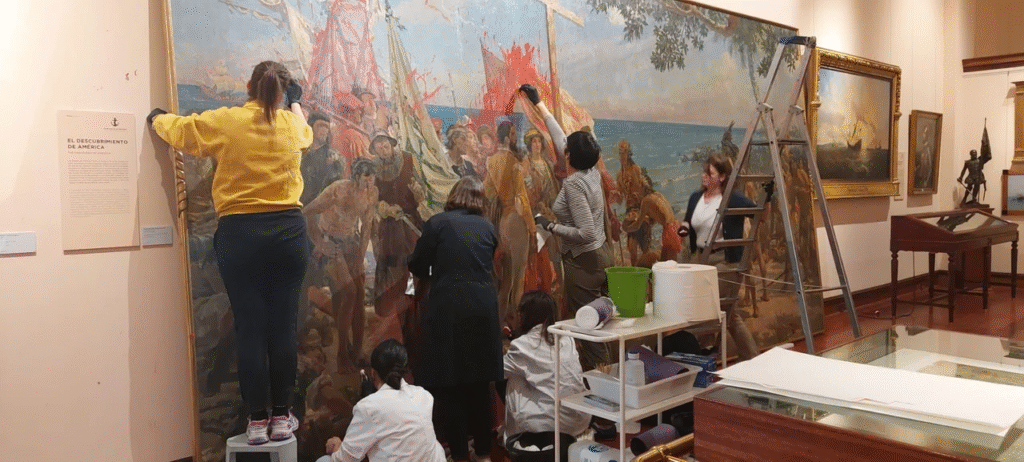 Dos integrantes del movimiento Futuro Vegetal lanzaron el domingo pintura roja contra la obra ubicada en el Museo Naval de Madrid.